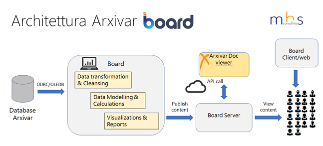 È stato creato un database/capsule Board con tutte le dimensioni presenti in ARXivar, collegate fra loro e navigabili a qualunque livello. È stata configurata un API-call per gestire l’apertura di qualsiasi documento gestito in ARXivar.