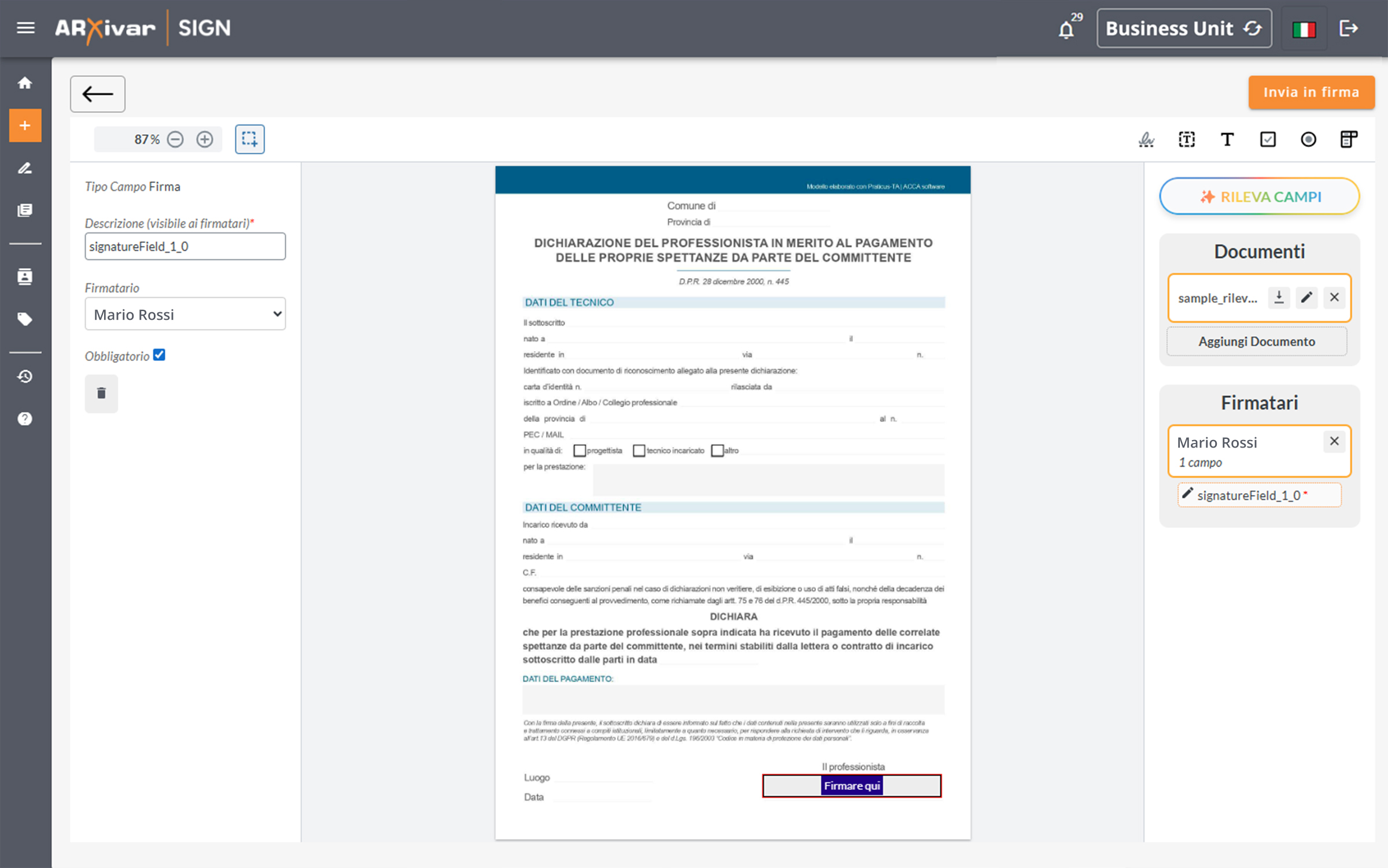 Crea una nuova sessione di firma sul portale dedicato e carica il documento digitale.